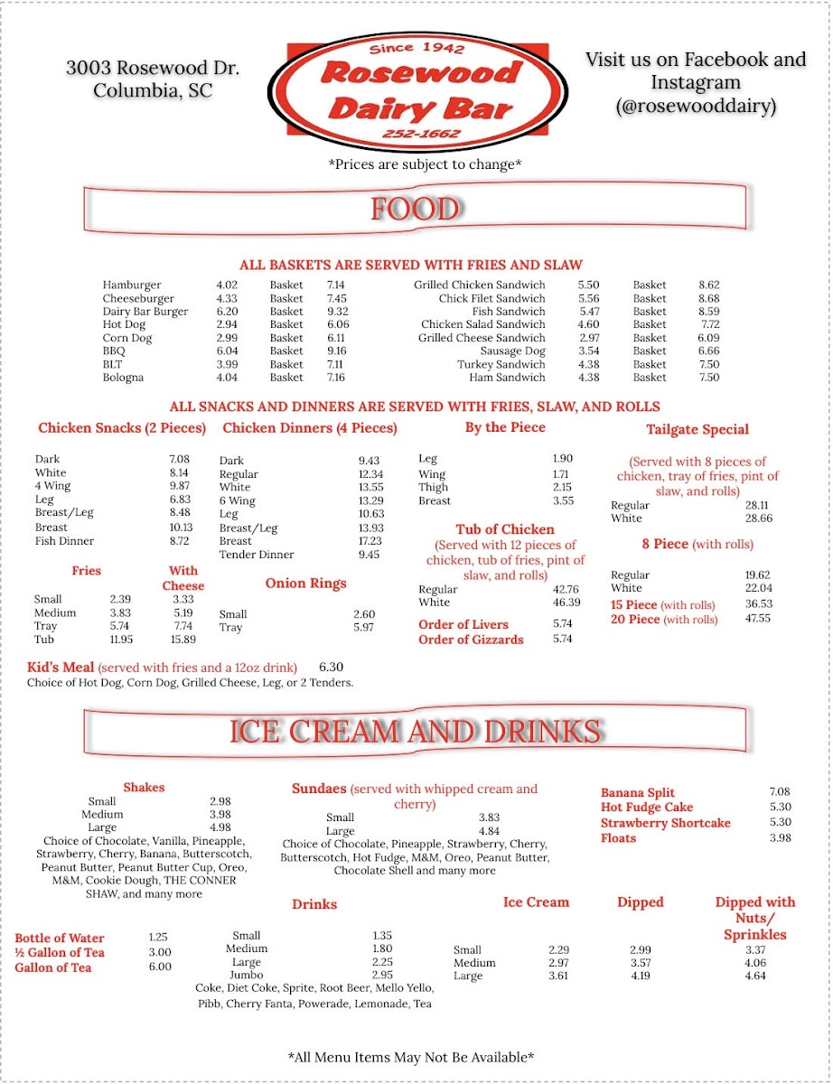 Welcome to Rosewood Dairy Bar, a charming fast food gem located at 3003 Rosewood Dr, Columbia, SC. This delightful eatery is revered for its mouthwatering selection of chicken and fish dishes, including individual tenders and savory snacks that are both hearty and satisfying. Priced affordably, a 2-piece Chicken Snack with fries, slaw, and rolls at just $7.62, embodies the essence of comfort food.